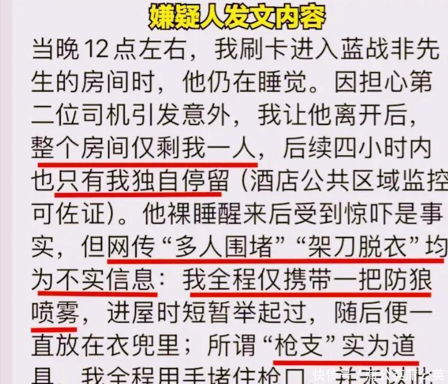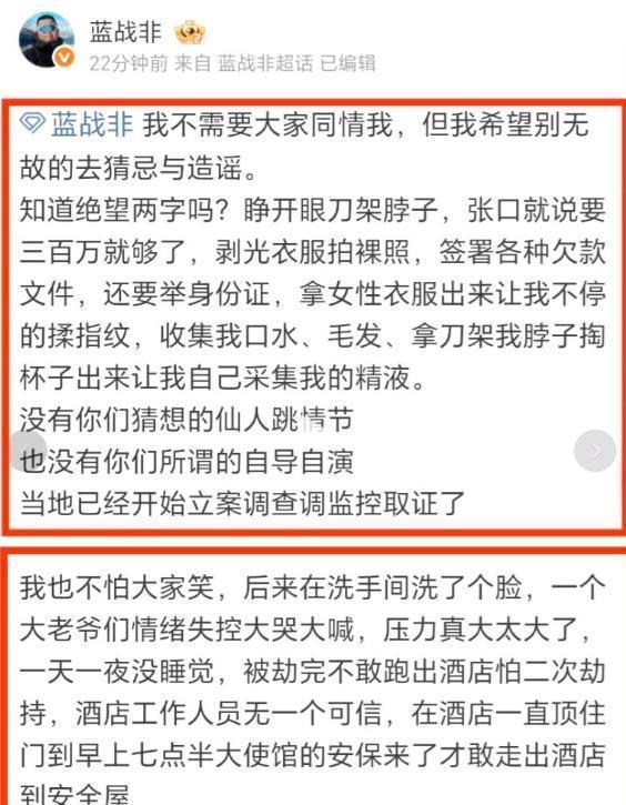 两个版本的"绑架",差了十万八千里最邪门的是,这个"Sorry"讲的故事跟蓝战非说的压根不是一回事。蓝战非那边怎么说的?凌点被刀架脖子惊醒,三个人闯进房间,持刀威胁了四五个小时,剥光衣服拍luo照,收集指纹毛发甚至J液,说要伪造强奸案不让他报警。