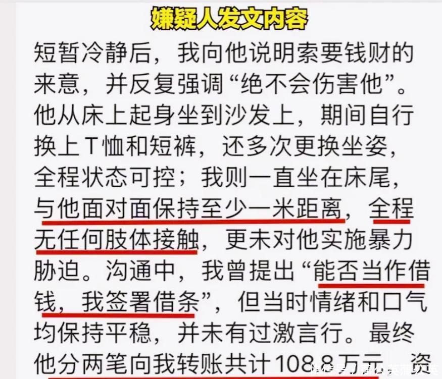 "Sorry"这边呢?说没有提前半年策划,机票酒店都是临时订的,没带两个黑人进房间,只有一个司机送他到门口,没用刀,用的是防狼喷雾和道具枪,全程保持一米距离,是以"写借条借钱"的名义要的钱。