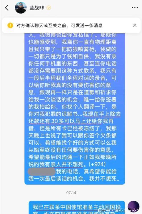 一个说惨烈绑架,一个说文明借钱。这差距也太大了吧。跑到卡塔尔自首,这操作看不懂更离谱的还在后面。这个"Sorry"说自己现在人在卡塔尔的中国大使馆,要自首求遣返,手里剩多万也愿意还给蓝战非。